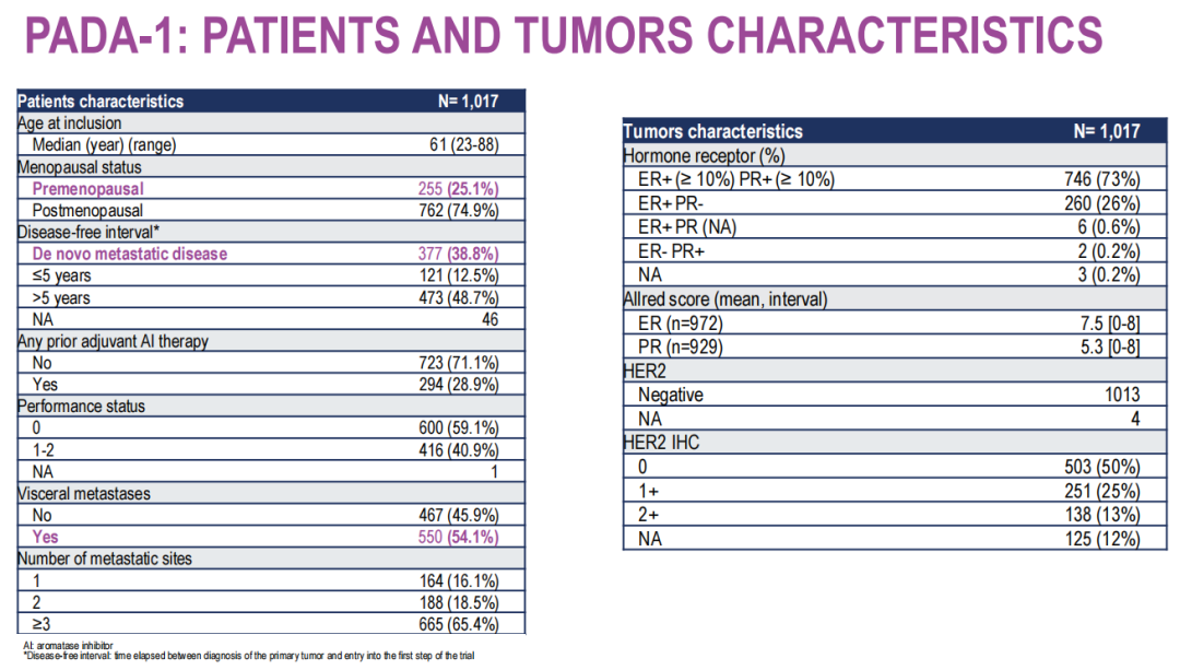 研究方法:PADA-1是一项Ⅲ期试验(NCT03079011),旨在研究分析对于ER≥10%、HER2阴性的晚期乳腺癌患者,一线使用哌柏西利联合AI的患者血液中检测ESR1基因突变的临床意义。近期,研究者进一步去探索了入组患者肿瘤样本中的ER(%)、PR(%)和HER2(0,1+,2+)IHC表达水平是否会影响哌柏西利联合AI治疗的PFS。
