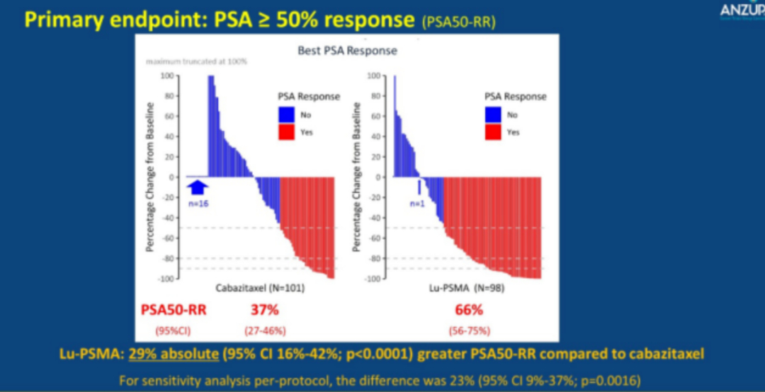 2020年ASCO报道中位随访11.3个月的数据显示达到主要终点,LuPSMA组相较于卡巴他赛组的PSA50-RR显著提高近一倍(66% vs 37%),PSA-PFS风险显著降低37%(HR 0.63,95%CI:0.45~0.88)。本次会议将报道中位随访3年的OS结果。