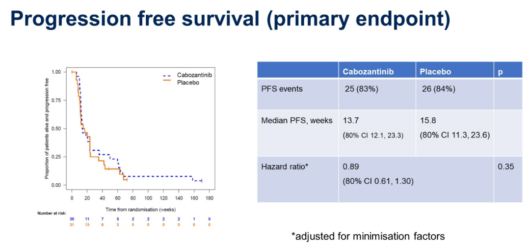 卡博替尼组和安慰剂组共发生25例(83.3%)和26例(83.9%)PFS事件,中位PFS分别为13.7周(80%CI:12.1-23.3)和15.8周(80%CI:11.3-23.6)(调整后HR 0.89,80%CI:0.61-1.3,P=0.35)。OS无显著差异(HR 0.80,80%CI:0.52-1.23,P=0.25)。