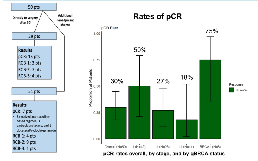 29例患者SG治疗后直接行手术治疗。总体上,单药SG的pCR率为30%(n = 15/50, 95% CI:18%~45%)。另外14例患者分别未达pCR:RCB-1(n=3)、RCB-2(n=7)和RCB-3(n=4)。在接受额外新辅助治疗的21例患者中,7例达到pCR(3例接受蒽环类治疗方案,2例接受卡铂/紫杉烷,1例接受多西他赛/环磷酰胺)。