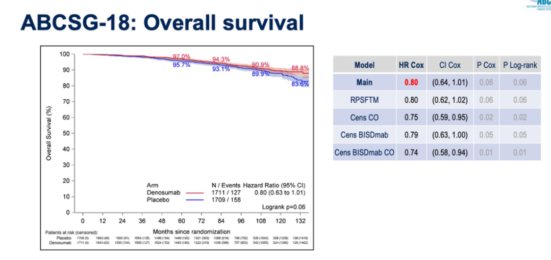 此次ASCO年会上报告了ABCSG-18试验的最终长期结果:中位随访时间为8年,中位治疗时间为5年。与安慰剂组相比,Dmab组改善了DFS[309例 vs. 368例DFS事件,风险比(HR)0.83,95%CI:0.71~0.97,P=0.016],9年DFS绝对差异为3.5%(79.4% vs. 75.9%)。当删失晚期交叉和使用抗吸收药物时,证实了DFS差异(HR 0.82,P=0.010)。
