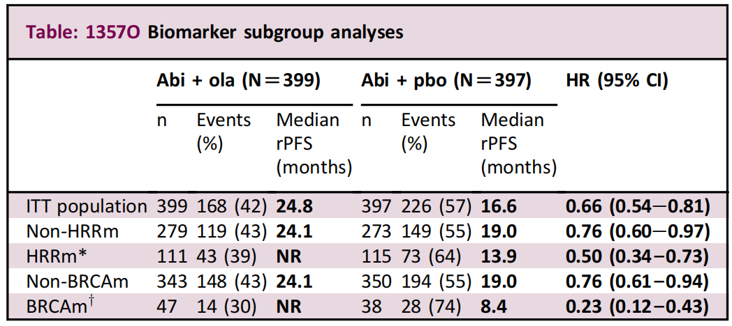 研究人员还进行了生物标志物分析,根据肿瘤组织和循环肿瘤DNA(ctDNA)检测结果对同源重组修复基因突变(HRRm)状态、BRCAm状态进行分层。我们可以看到:无论是非HRRm还是HRRm(rPFS HR分别为0.76和0.56),无论是非BRCAm还是BRCAm(rPFS HR分别为0.76和0.23)患者,都可以从abi+ola治疗中获益,但是HRRm和BRCAm患者的获益程度确实更大。