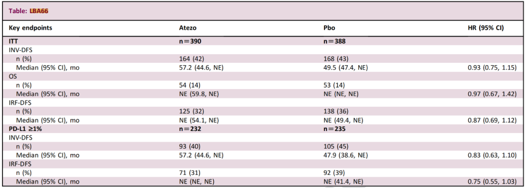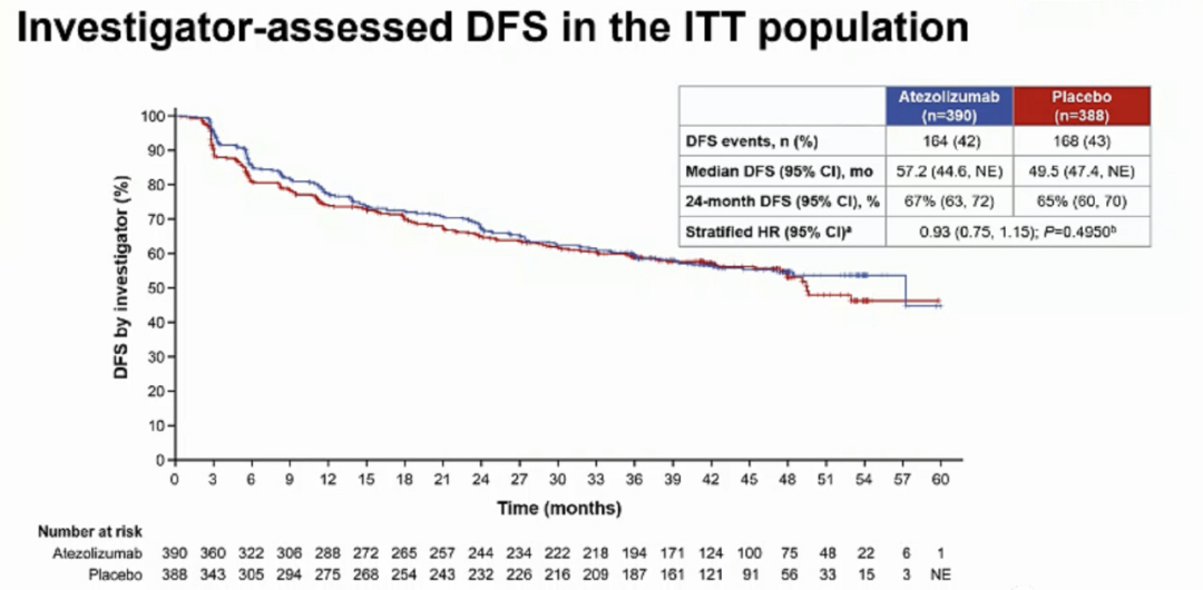 研究结果显示:尽管阿替利珠单抗的INV-DFS在数值上有所延长,但并无显著统计学意义(57.2 vs 49.5个月;HR 0.93,95%CI:0.75~1.15;P=0.495)。此外,在OS、IRF-DFS以及PD-L1≥1%人群的INV-DFS等次要终点中,也没有看到阿替利珠单抗的显著获益。在安全性方面,免疫治疗组和安慰剂的Gr 3/4 AE分别为27%和21%,Gr 5级AE均<1%。