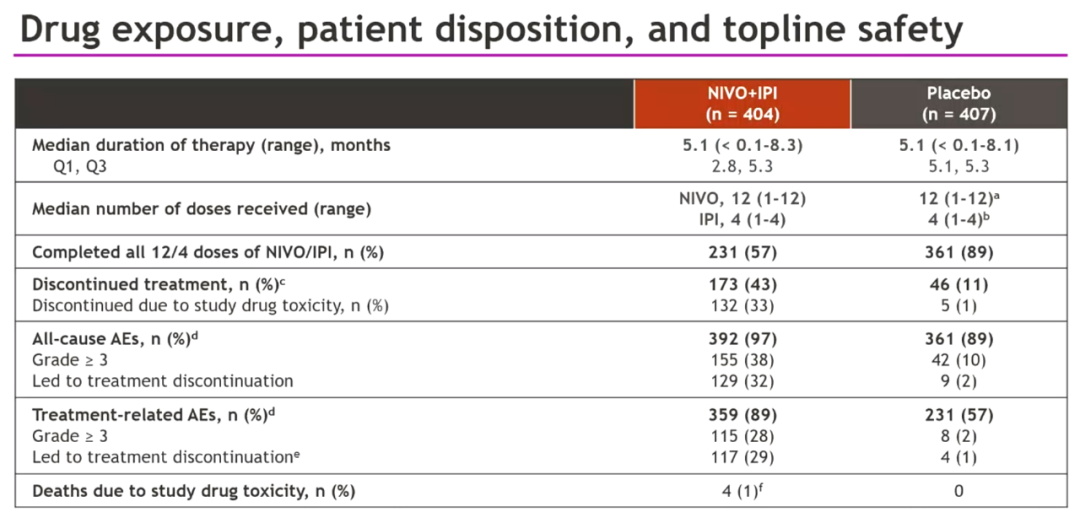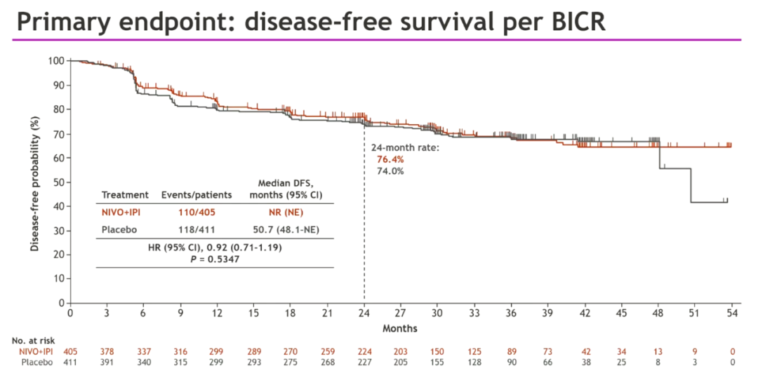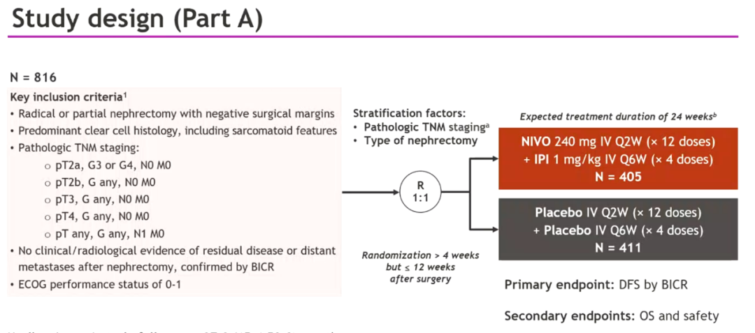该研究的关键入组标准也是聚焦于中高危人群,包括:T2a(G3或4)、T2b(任何G)、T3(任何G)、T4(任何G)的N0M0,以及任何T(任何G)N1M0。患者随机(1:1)接受n“O+Y”双免治疗(纳武利尤单抗240 mg Q2W共12剂,伊匹木单抗1 mg/kg Q6W共4剂)或安慰剂。主要终点是盲法独立中心评价的DFS;次要终点包括OS和安全性等。