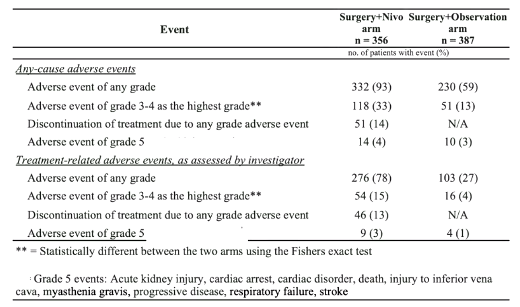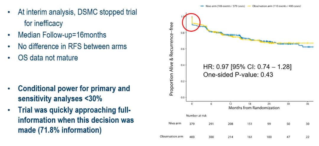 遗憾的是,该研究也没有达到主要终点,两组之间的RFS相似(NR vs NR;HR 0.97;95%CI:0.74~1.28;P单侧=0.43)。OS尚未成熟,但没有统计学差异(HR 1.48;95%CI:0.89~2.48;P单侧=0.93)。两组的退出率相似,约为12%;免疫治疗组和观察组的3/4级AE分别为20%和6%。由于没有看到获益趋势,DSMC已经提前终止试验。