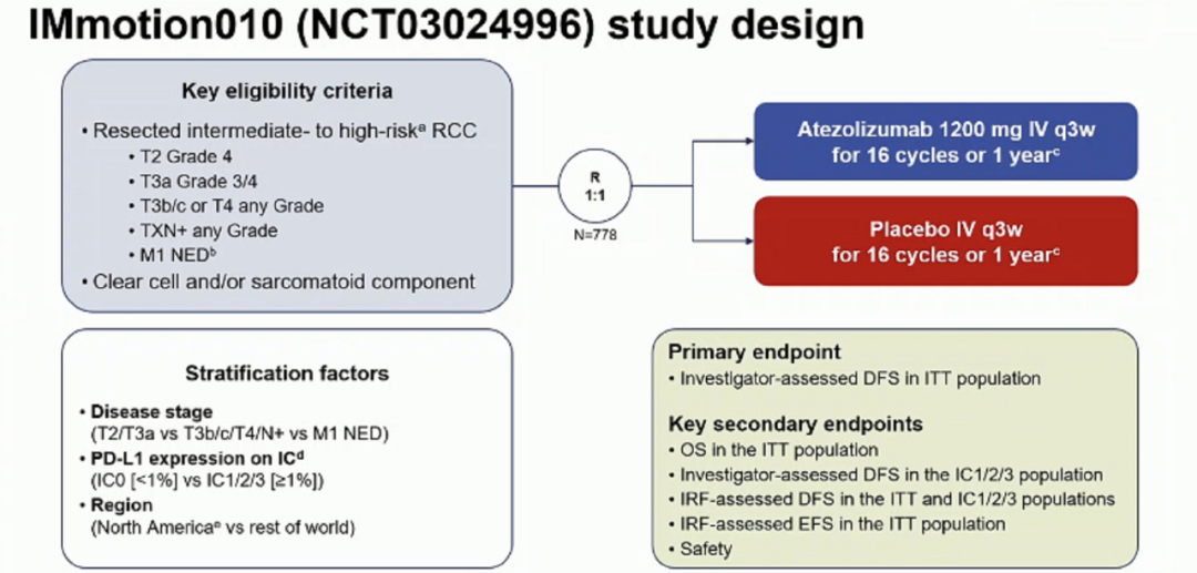 这项研究的入组患者与KEYNOTE-564研究基本相似,关键入组标准:具有透明细胞或肉瘤样成分的肾细胞癌,以及T2 G4、T3aG3/4、T3b/c或T4任何G、TxN+任何G或M1等中高危患者。患者随机(1:1)接受PD-L1抑制剂阿替利珠单抗(1200 mg IV q3w)或安慰剂治疗,共16个周期或1年。主要终点是研究者(INV)评估的无病生存期(DFS)。次要终点包括ITT人群的OS和独立审查机构(IRF)评估的DFS,以及PD-L1免疫细胞表达≥1%(VENTANA SP142 IHC检测)患者的INV-DFS和IRF-DFS。