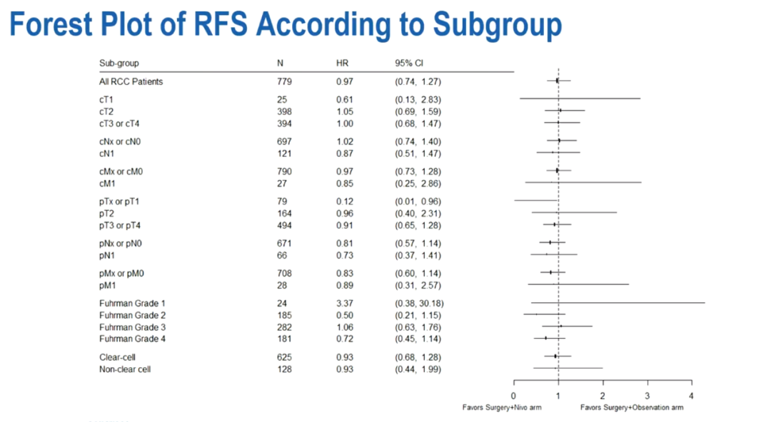 从入组患者基线特征来看,透明细胞癌患者比例为83%,也就是说非透明细胞癌比例高达17%,如果入组患者均为透明细胞癌是否能改变研究结果?这个问题很难说,从亚组分析来看透明细胞和非透明细胞癌的RFS获益相似;cT2占53%、cT3-4占47%、cN1占17%和cM1占4%,但亚组分析中不同分期患者的RFS获益也是相似的。此外,免疫治疗组的不良事件更高,但两组的试验退出率相似。尽管这种术前+术后治疗的模式更符合免疫原理,但遗憾的是该研究并未如预期那样取得RFS的阳性结果。