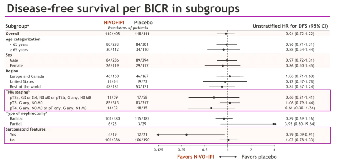 研究结果显示并未达到主要终点,尽管双免治疗组和安慰剂组的中位DFS分别为未达到和50.7个月,但HR为0.92(95%CI:0.71-1.19;P=0.5347)。在安全性方面,双免治疗组和安慰剂组的≥3级AE分别为28.5%和2.0%,停药率分别为29.0%和1.0%。这样的研究结果与我们国内参研中心的基本印象是一致的。值得注意的是,亚组分析中T2、T4期和肉瘤分化特征的患者有获益趋势,但样本量较小。