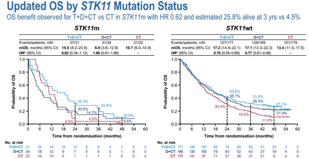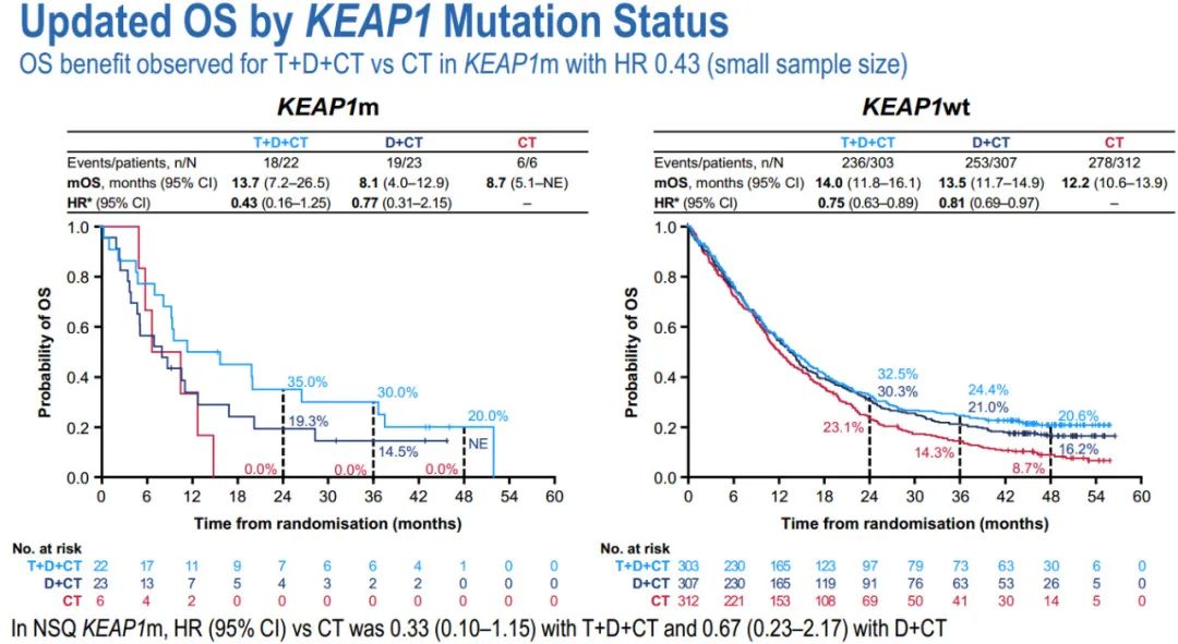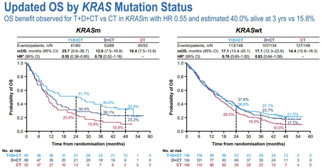 在不同突变状态患者中,OS获益持续倾向于T+D+CT方案:T+D+CT和单纯化疗在STK11突变阳性人群的中位OS为15.0个月和10.7个月(HR=0.62;95%CI:0.34-1.12);在KEAP1突变患者中的中位OS分别为13.7个月和8.7个月(HR=0.43;95%CI:0.16-1.25)(该患者群体样本量小);在KRAS突变患者的中位OS分别为25.7个月和10.4个月(HR=0.55;95%CI:0.36-0.85)。