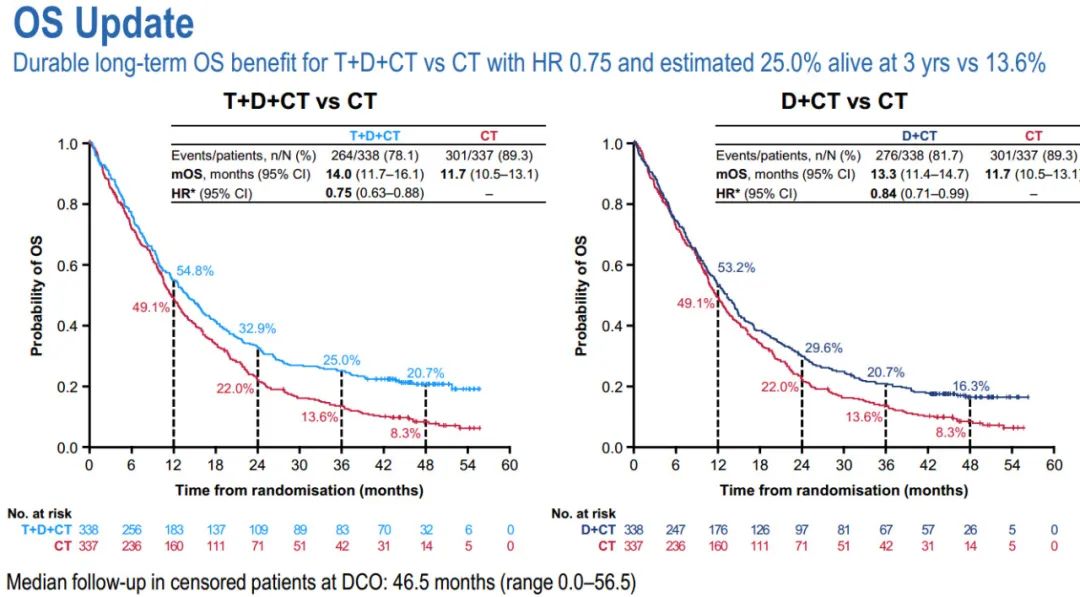 T+D+CT组的中位OS为14.0个月(95%CI:11.7-16.1),而单独化疗组为11.7个月(95%CI:10.5-13.1)(HR=0.75;95%CI:0.63-0.88),36个月OS率分别为25.0%和13.6%,48个月OS率分别为20.7%和8.3%。三联方案相比单独化疗将死亡风险降低25%。D+CT组的中位OS为13.3个月(95%CI:11.4-14.7),而单用化疗组的中位OS仅有11.7个月(HR=0.84;95%CI:0.71-0.99)。