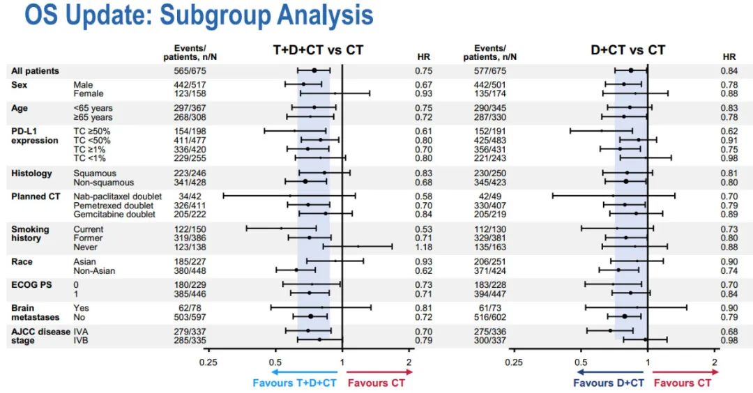 OS亚组分析显示,所有接受免疫治疗+化疗的患者的OS均有改善趋势。在度伐利尤单抗+化疗的基础上加入曲美木单抗,使PD-L1 TC<1%的患者持续延长OS获益。