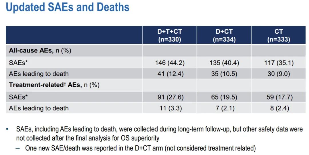 长期随访收集了严重不良事件(AEs),但OS最终分析后没有收集其他安全性数据。在SAEs的长期随访中未观察到新的安全信号,度伐利尤单抗+化疗组报告了1例患者“死亡”,但不被认为与治疗有关。