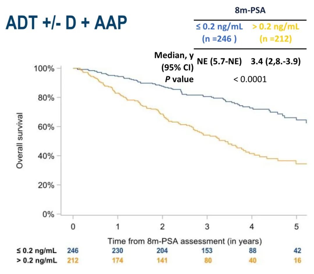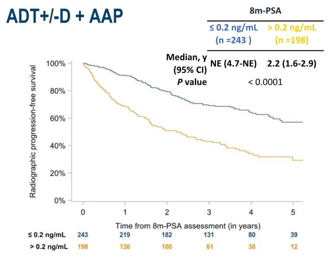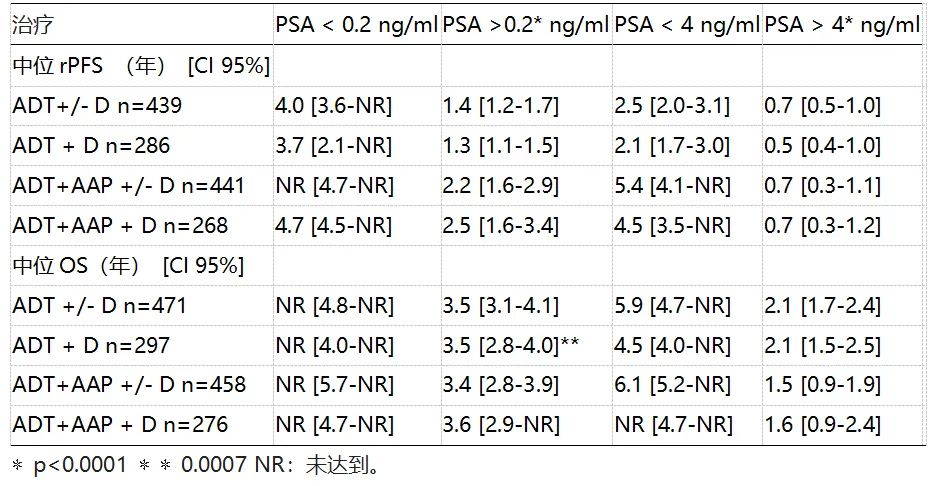 对1172例接受ADT+/-D+/-AAP治疗且ADT开始后8个月有PSA值的患者数据进行预设分析。数据截至2021年6月1日。评估总体和各随机组的rPFS和OS。8个月PSA的分析截断值为0.2和4 ng/ml。采用Kaplan-Meier法计算基于8个月PSA值的中位rPFS和OS。