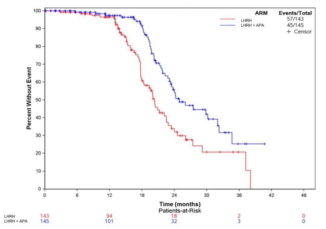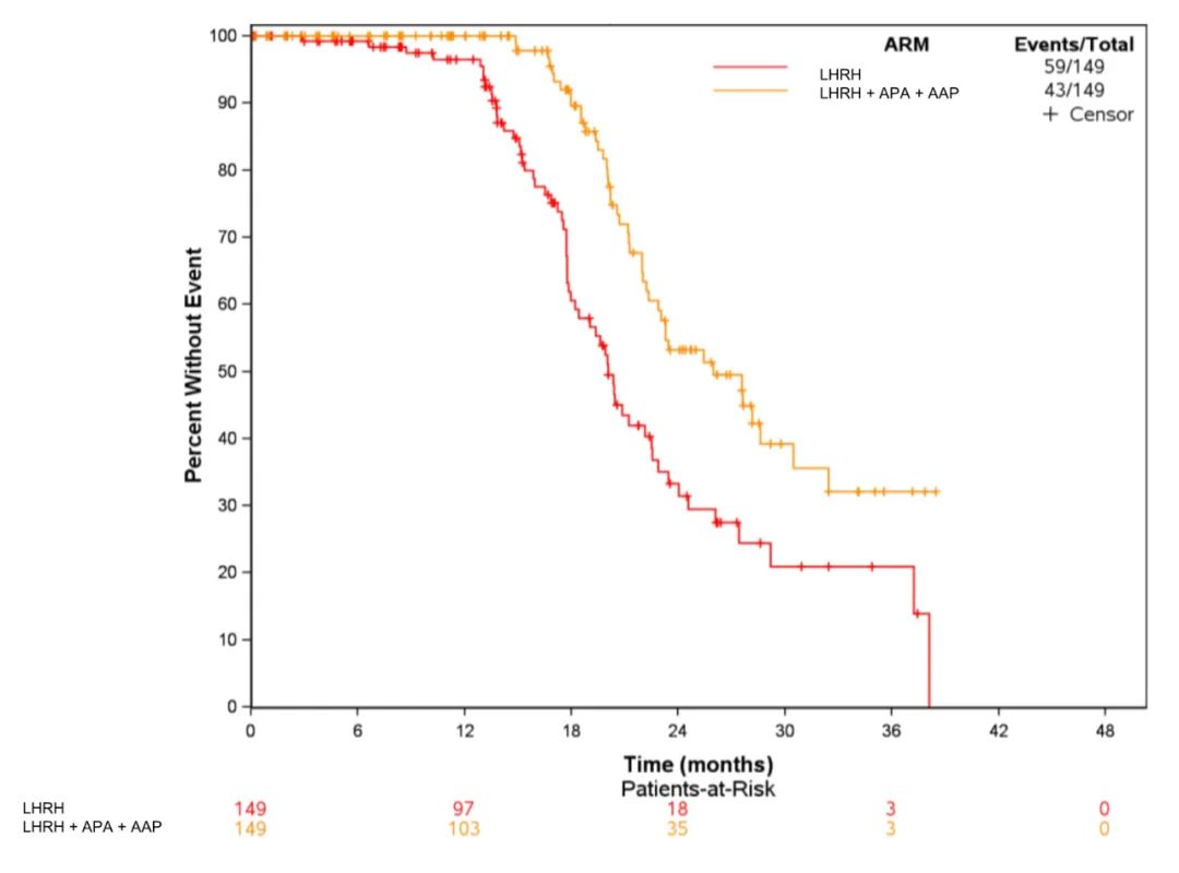 504例患者随机分至ADT组(N=167)、ADT+APA组(N=168)和ADT+ADA+AAP组(N=169)。预设的中期分析结果显示,与对照组ADT相比,两个试验组的中位bPFS均显著延长(ADT+APA组24.9个月vs.ADT组20.3个月,HR=0.52[95%CI:0.35–0.77];ADT+APA+AAP组26.0个月vs.ADT组20.0个月,HR=0.48[95%CI:0.32–0.71]),详见图5。ADT、ADT+APA和ADT+APA+AAP三组的中位TTTR分别为3.9、3.8和4.7个月。最常见的≥2级不良事件为高血压(ADT组19.4%,ADT+APA组23.4%,ADT+APA+AAP组30.4%)。所有治疗组中有8例(1.8%)患者因不良事件停止治疗。QoL、MFS和TTCR分析的随访工作仍在进行。