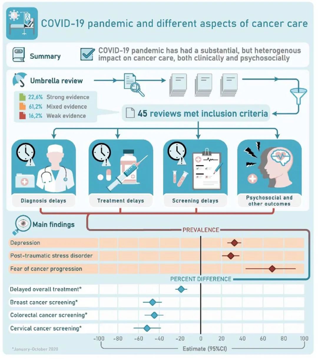 在COVID-19大流行期间,多项系统综述评估了COVID-19对癌症筛查、治疗和诊断的中断以及对患者心理健康的影响。这些研究跨越疫情各个时期,涉及多个研究结局。近期,研究人员基于这些系统综述文章,发表了一篇总括性综述。