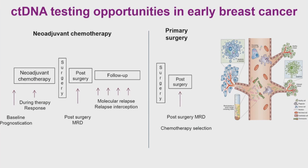 ctDNA是在血液循环中检测肿瘤特异性的DNA片段,有越来越多的文献支持其应用于早期乳腺癌,包括预测乳腺癌的复发风险、检测术后的微小残留疾病(MRD,这是传统影像学检测不了的亚临床转移疾病),以及指导强化治疗和降阶治疗。近年来,ctDNA检测主要分为“Tumour informed asssays”(肿瘤先验分析)和“Tumour agnostic assays”(肿瘤未知分析),前者是先进行肿瘤组织测序以筛选特异性突变,再通过数字PCR或RaDaR等高灵敏方法进行检测;后者则是不依赖于组织,检测特异性的甲基化等。