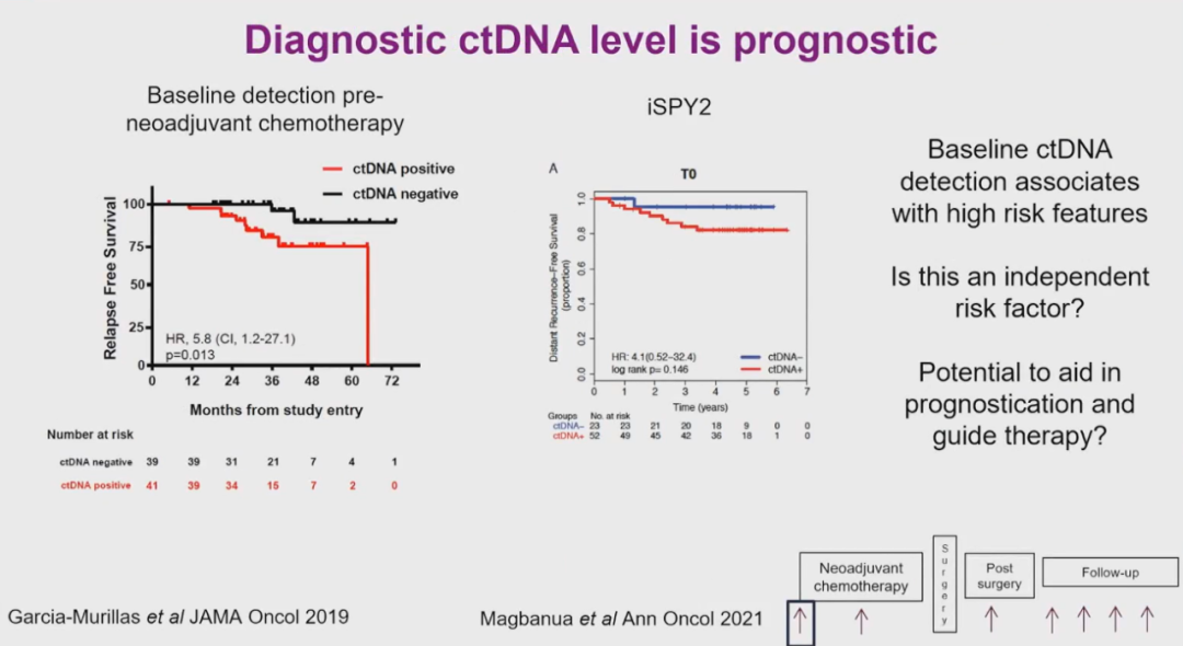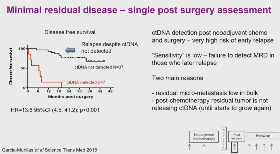 ctDNA可用于新辅助和手术后(接受辅助治疗前)的复发风险评估。Garcia-Murillas等人(Science Trans Med.2015)报道的小样本研究显示,相较于术后未检测到ctDNA者,检测到ctDNA者的疾病风险显著增加12倍多(HR 13.6)。但Turner教授认为,ctDNA在迟发性复发患者中的敏感性仍较低,可能由于仅有散在的微小转移残存疾病;经过新辅助化疗,残存肿瘤无法释放ctDNA。