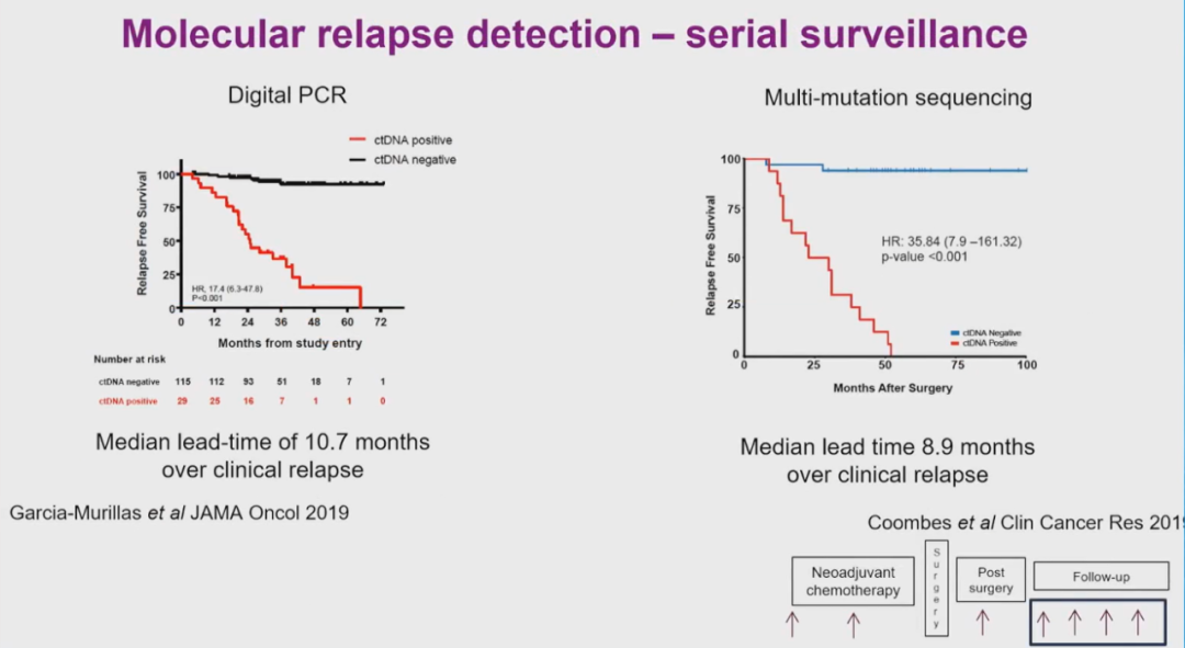 在接受手术或辅助治疗后,影像学检查等传统随访监测手段难以发现亚临床疾病,而ctDNA可作为分子复发的监测手段,更早地发现疾病复发迹象。Garcia-Murillas等人使用数字PCR监测ctDNA的研究(JAMA Oncol.2019)显示,在术后10.7个月的中位随访中,ctDNA阳性患者的复发风险相较于阴性患者增加了16倍多(HR 17.4);Coombes等人(Clin Cancer Res.2019)使用多突变测序监测ctDNA,结果显示ctDNA阳性患者的复发风险增加近35倍(HR 35.84)。