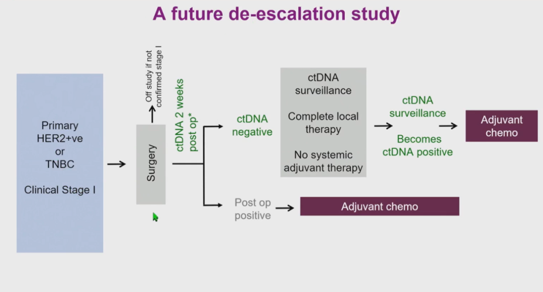 在乳腺癌领域,肿瘤浸润性淋巴细胞(TILs)被认为是TNBC患者5年DDFS的有利因素(Loi,JCO 2019);APT研究则对<2cm的HER2阳性乳腺癌进行化疗降阶(单周紫衫联合曲妥珠单抗),这些都可能是乳腺癌降阶化疗的尝试。Turner教授进一步分享了未来ctDNA用于指导降阶治疗的研究设计。