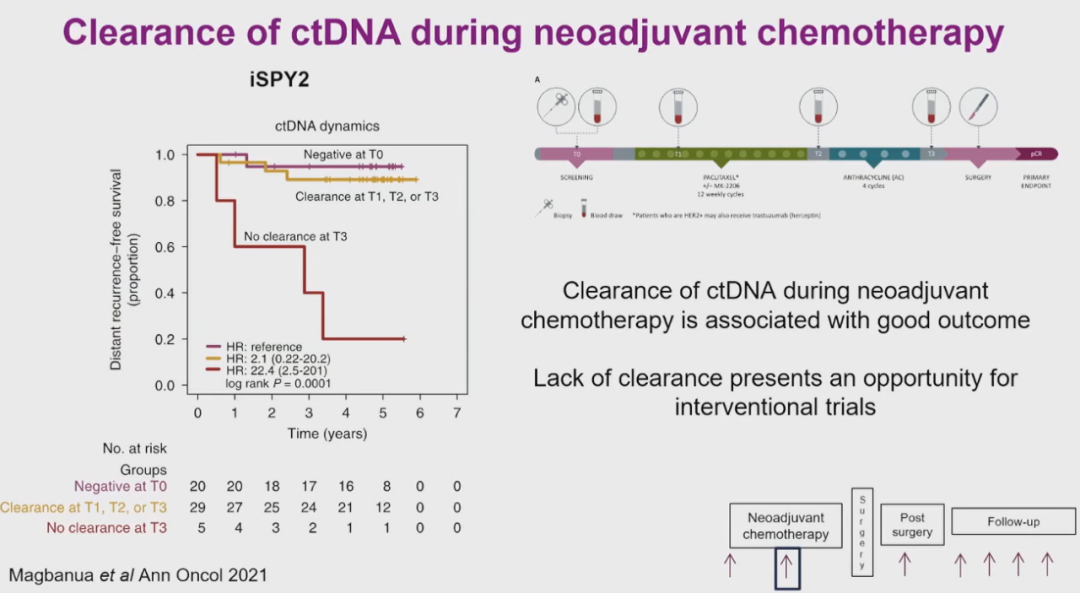 在新辅助治疗中,已有研究显示基线ctDNA与高危复发特征相关。例如,iSPY2研究(Magbanua,Ann Oncol.2021)显示,基线ctDNA阳性患者的复发风险是阴性患者的4倍多(HR 0.41)。反之,通过新辅助治疗达到ctDNA转阴的患者,与更好的临床结局相关。iSPY2研究中,相较于T0期ctDNA阴性患者,T1-3期ctDNA转阴患者的HR为2.1,而T3期没有转阴的患者,复发风险高达22倍(HR 22.4)。