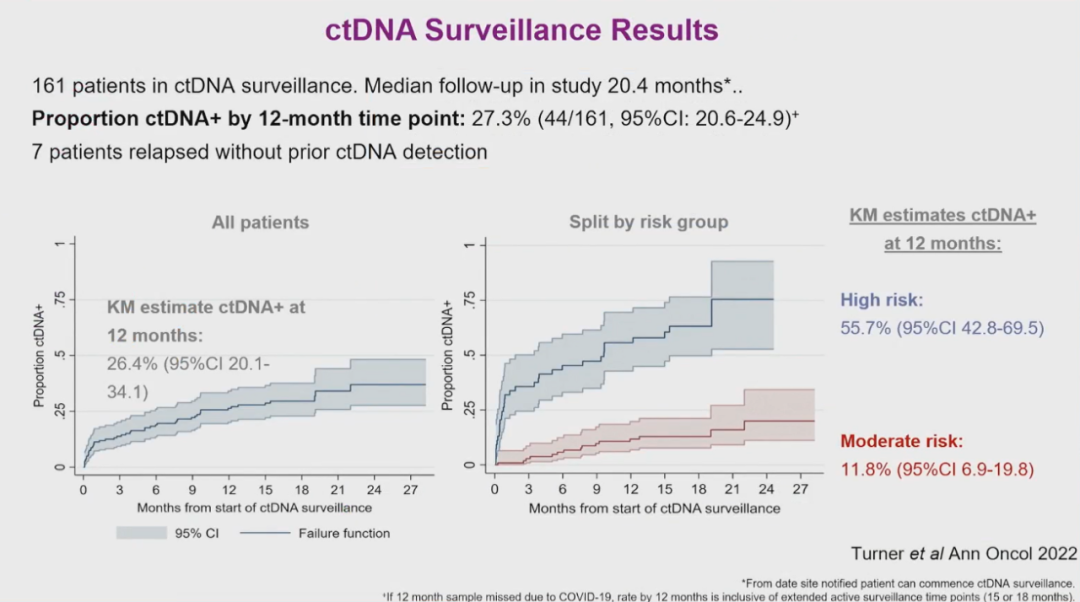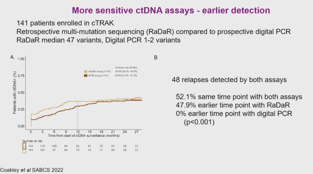 Turner教授领导的一项随机双盲、2期、概念验证性试验cTRAK-TN研究(Ann Oncol.2022),入组了161例早期TNBC患者,使用数字PCR ctDNA进行随访监测,结果显示12个月的ctDNA阳性率为27.3%(高危、中危患者分别为55.7%和11.8%);45例ctDNA阳性患者则随机(2:1)接受帕博利珠单抗干预组(n=32,ctDNA监测12个月,每月一次)或继续观察(n=14,监测24个月,每月1次),干预组患者中有71.9%在ctDNA阳性时已经出现了分期转移。另一项cTRAK的研究(Coakley,SABCS 2022)则对比了回顾性多突变测序(RaDaR)和数字PCR用于早期监测的敏感性差异,结果显示RaDaR可以更早的发现疾病。