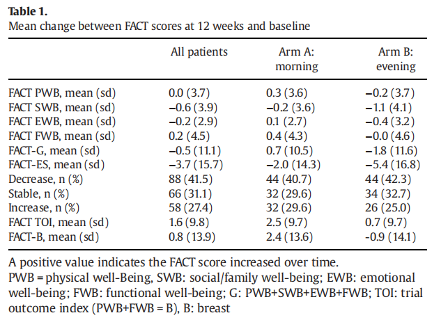 研究方法:在这项实用性、多中心、开放标签的临床试验中,激素受体阳性的早期乳腺癌患者(1∶1)被随机分配接受ET的早晨给药组(A组:患者起床后1小时内)或晚上给药组(B组:患者睡前1小时内)。患者根据研究中心、ET类型和既往化疗情况进行分层。本文给出的结果来自意向治疗的主要终点分析,其定义为内分泌治疗的毒性和耐受性,通过肿瘤内分泌治疗功能评估量表(Functional Assessment of Cancer Therapy-Endocrine Subscale,FACT-ES)总分从基线至ET开始后12周的变化来衡量。