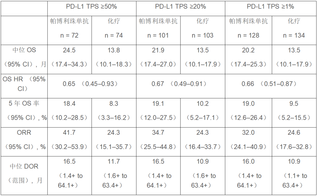 帕博利珠单抗与化疗相比延长了患者的OS,其中PD-L1 TPS≥50%患者的HR值为0.65(95%CI:0.45–0.93),PD-L1 TPS≥20%患者的HR为0.67(95%CI:0.49–0.91),PD-L1 TPS≥1%患者的HR为0.66(0.51–0.87)。在所有3个PD-L1 TPS组中,帕博利珠单抗组与化疗组相比,5年OS率翻倍(见表1)。3-5级TRAE发生率:帕博利珠单抗组19.5%vs.化疗组68.8%。在完成35个帕博利珠单抗周期的22例患者中,客观缓解率(ORR)为81.8%(95%CI:59.7%-94.8%),完成35个周期后(随机化后约5年)的3年OS率为56.6%。至数据截止日期,帕博利珠单抗组和化疗组分别有80例和79例患者已经开始后续治疗;5例患者开始第二个疗程的帕博利珠单抗治疗。