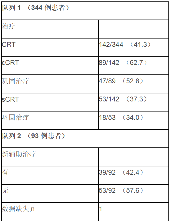 队列1中,41.3%(142/344)的患者接受了放化疗(CRT),其中62.7%(89/142)接受了同期放化疗(cCRT),37.3%(53/142)接受了序贯放化疗(sCRT)。同步放化疗后,52.8%(47/89)的患者接受了巩固治疗,其中59.6%(28/47)的患者接受了免疫治疗。接受sCRT治疗的患者中,34.0%(18/53)接受了巩固治疗,以化疗为主(44.4%,8/18)。在队列2中,所有93例患者均接受了手术,42.4%(39/92)接受了新辅助治疗(表2)。