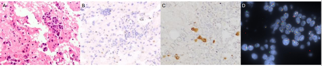 经超声支气管镜纵膈淋巴结取样,右侧气管旁和隆突下淋巴结站的病理检测结果符合非小细胞癌(图2A)。免疫组织化学(IHC)染色显示p40弥漫阳性,TTF-1和Napsin A阴性,符合非小细胞癌,偏向鳞状细胞癌。IHC还显示绝大多数肿瘤细胞的BRG1核表达缺失(图2B),未出现PD-L1膜染色。基于DNA和RNA的二代测序(NGS)发现了F11R基因的第6外显子与神经营养受体酪氨酸激酶1(NTRK1)的第10外显子融合,此外还有KEAP1 G364C突变、STK11剪接变异、PIK3R1 N630T突变和有害的SMARCA4剪接变异。