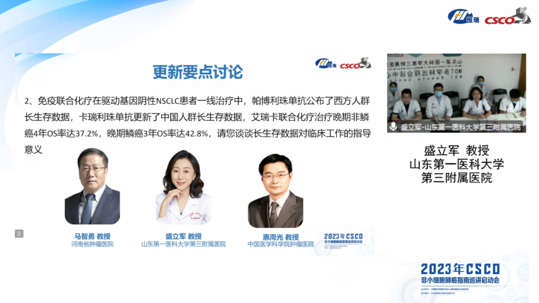 讨论环节中,吉林大学第一医院崔久嵬教授、山西省肿瘤医院宋霞教授、河南省肿瘤医院马智勇教授、山东第一医科大学第三附属医院盛立军教授、中国医学科学院肿瘤医院惠周光教授聚焦2023 CSCO指南更新要点展开了深入探讨,包括HER2突变晚期NSCLC后线治疗药物选择、CameL研究和CameL-sq研究4年更新长生存数据对中国临床的指导意义等。专家表示,药物可及性和基于中国患者生存的直接证据仍是临床实践的关键考量要素,吡咯替尼仍将是HER2突变晚期NSCLC后线治疗的可及治疗方案;CameL和CameL-sq均是在中国人群中开展的大样本III期研究,卡瑞利珠单抗联合化疗使近四成的非鳞癌患者生存超过了4年,耀眼数据可圈可点,卡瑞利珠单抗已纳入医保,堪当晚期NSCLC一线治疗中的标准治疗基石。