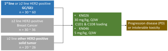 Jifang Gong,et al.Efficacy and safety of KN026 in combination with KN046 in patients with locally advanced unresectable or metastatic HER2-positive other solid tumors.Presented at:2023 ASCO Annual Meeting,June 2-7,2023.Abstract 3621.