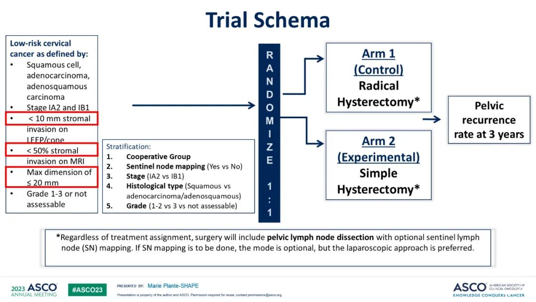 SHAPE试验纳入700名低风险IA2或IB1期宫颈癌患者,患者按1:1随机分入根治性子宫切除术和单纯性子宫切除术两组。两个手术组都包括盆腔淋巴结清扫和可选的前哨淋巴结(SN)定位。