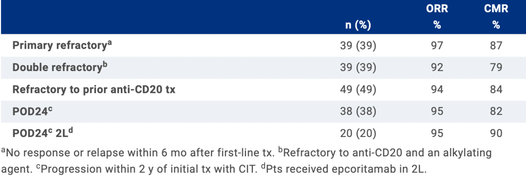 结果显示,在101例可评估疗效的患者中,总有效率(ORR)为97%,完全代谢缓解(CMR)为86%。值得注意的是,与他们之前的初始治疗相比,艾可瑞妥单抗+R2治疗后患者获得了更高的ORR率(97%vs.85%)和CMR率(86%vs.60%)。估计6个月无进展生存率为93%。在既往接受过epcoritamab二线治疗的POD24患者中,ORR和CMR率分别是95%和90%。目前研究仍在进行当中,未来将提供后续随访数据。