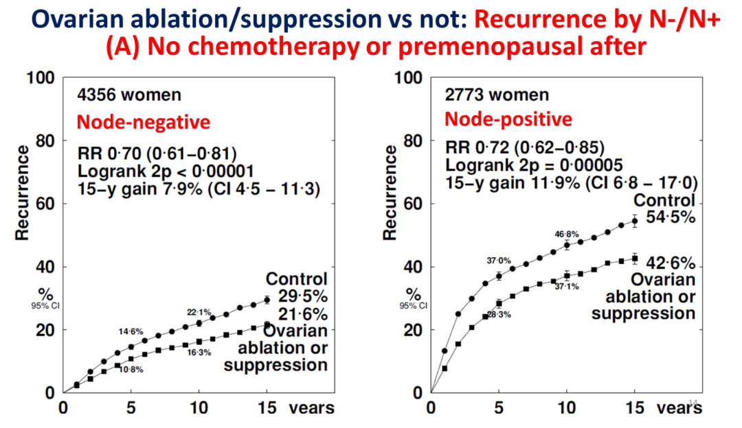 对于淋巴结阴性和阳性的未化疗或化疗后未绝经患者,卵巢切除/抑制同样均可降低患者复发风险。在淋巴结阴性人群,卵巢切除/抑制较未切除/抑制患者15年复发率降低7.9%(21.6%vs 29.5%,RR=0.70,0.61-0.81,logrank 2P<0.00001);在淋巴结阳性人群15复发风险则降低11.9%(42.6%vs 54.3%,RR=0.72,0.62-0.85,logrank 2P=0.00005)(图5)。