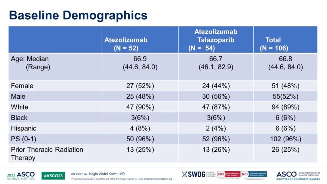 共计106例患者接受随机,中位随访时间5个月,患者中位年龄66.8(范围,44.6-84.0),48%为女性,89%为白人,96%的患者PS评分0~1分,25%的患者既往接受过胸部放疗。