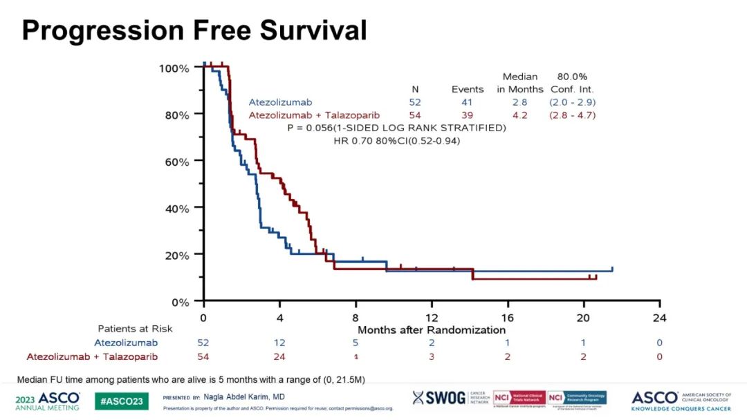 80例患者报道PFS事件,talazoparib+阿替利珠单抗组和单独接受阿替利珠单抗组的中位PFS分别为4.2个月和2.8个月(HR=0.70,80% CI: 0.52~0.94,P=0.056)。