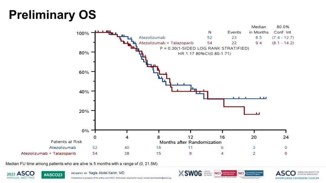 OS数据尚不成熟,但两组间的OS无显著差异。单用阿替利珠单抗组的中位OS为8.5个月,talazoparib联合组为9.4 个月(HR=1.17;80% CI: 0.80-1.71;P=0.30)。