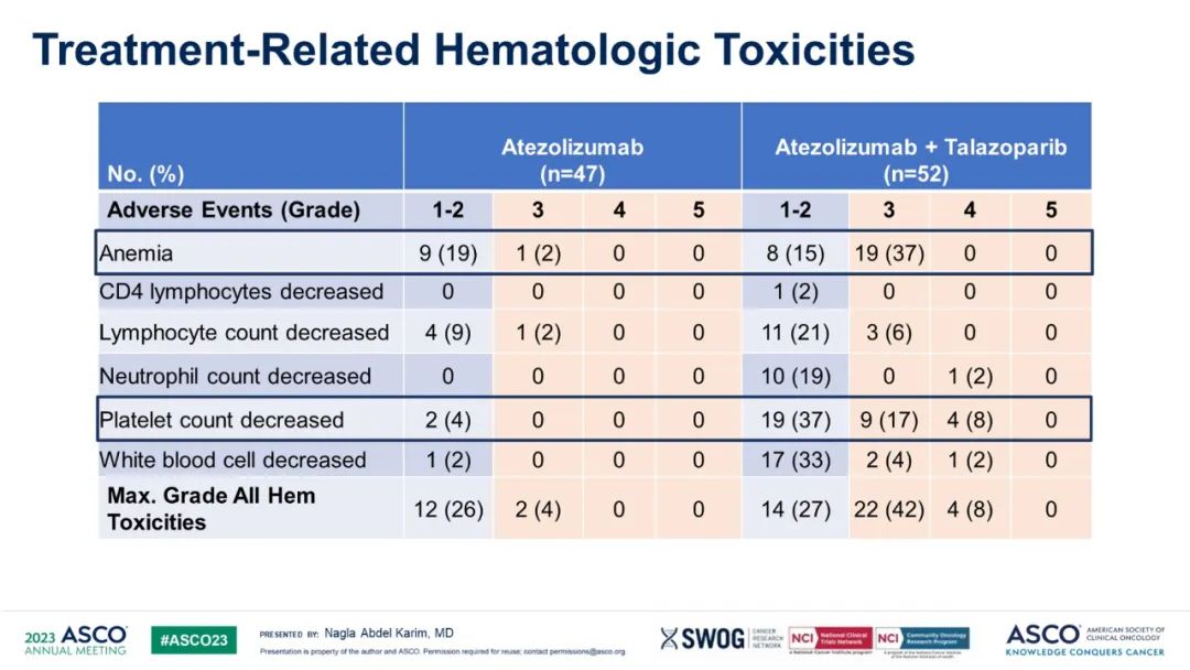 3级或以上的血液学不良事件(AE)在 talazoparib 联合组比阿替利珠单抗单药组更常见(分别为 50%和4%;P<0.0001),3度及以上治疗相关非血液学AE发生率相似,分别为15%和13%,没有治疗相关的5度不良事件出现,3度及以上贫血发生率分别为37%和2%,talazoparib组有1例患者出现3度粒细胞缺乏性发热。3 名患者因毒性而停止治疗——2 名在阿替利珠单抗单药组,1 名在talazoparib组。没有与治疗相关的死亡。