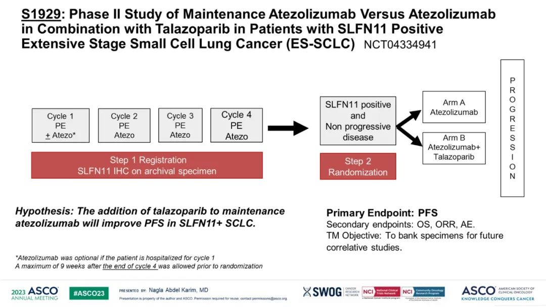 Karim NFA, Miao J, Reckamp KL, et al. SWOG S1929: Phase II randomized study of maintenance atezolizumab (A) versus atezolizumab + talazoparib (AT) in patients with SLFN11 positive extensive stage small cell lung cancer (ES-SCLC). ASCO 2023. June 2-6, 2023. Abstract 8504.