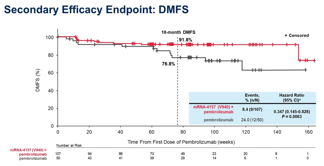 mRNA-4157是一种基于mRNA的新型个体化癌症疫苗,可编码多达34种患者特异性肿瘤新抗原。mRNA-4157-P201/Keynote-942试验(NCT03897881)已达到其主要终点,即无复发生存期(RFS)。既往已公布的结果显示,与帕博利珠单抗单药治疗相比,联合治疗的RFS有统计学意义和临床意义的改善,复发或死亡的风险降低了44%(HR 0.561,95%CI:0.309~1.017,单侧P=0.0266)。本报告首次分析了无远处转移生存期(DMFS)的次要疗效终点。