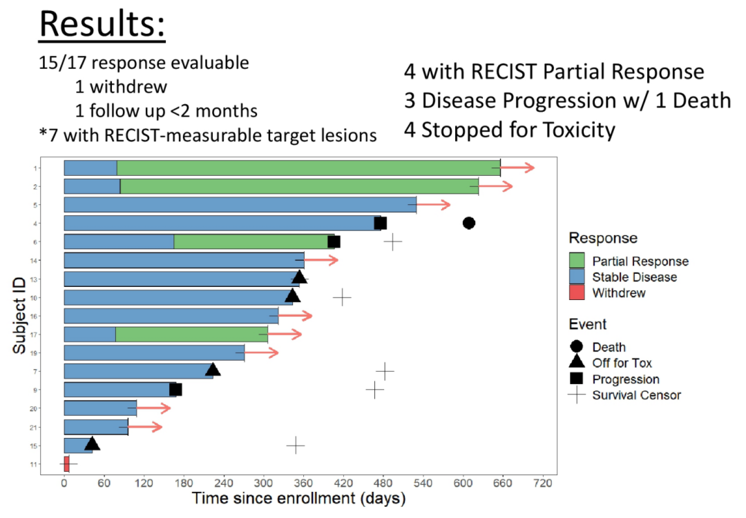 此次ASCO大会报道了一项1b期的剂量递增试验,在ADT+阿比特龙的基础上,联合纳武利尤单抗、卡博替尼治疗mHSPC患者,结果显示安全性良好,没有观察到剂量限制性毒性(DLTs),并且展示了积极的抗肿瘤活性(在7例可评估患者中,有4例达到PR)。