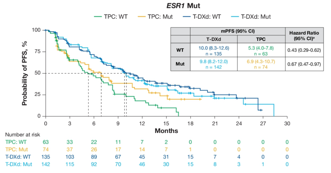 ESR1野生型(10.0 vs 5.3个月,HR 0.43)、突变型(9.8 vs 6.9个月,HR 0.67)的T-DXd治疗获益也保持一致;T-DXd治疗这两种ESR1状态患者的PFS相似(10.0 vs 9.8个月)。