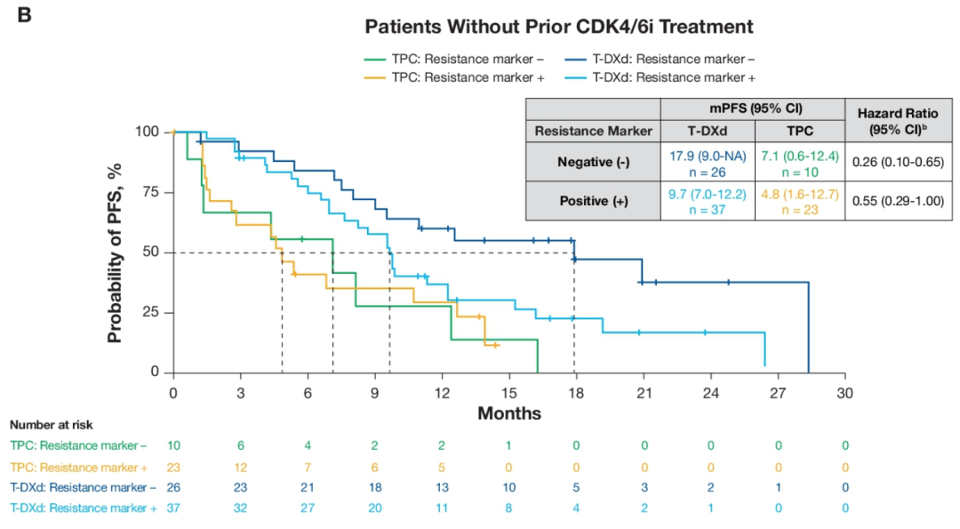 在未经CDK4/6i治疗的患者中,CDK4/6i耐药标志物阳性患者的PFS事件风险降低74%(HR 0.26),阴性患者(HR 0.55)也有较好的获益。值得注意的是,在未经CDK4/6i而初次接受T-DXd治疗的标志物阴性患者中,PFS长达17.9个月,预示T-DXd在前线治疗中可能有巨大应用潜力。