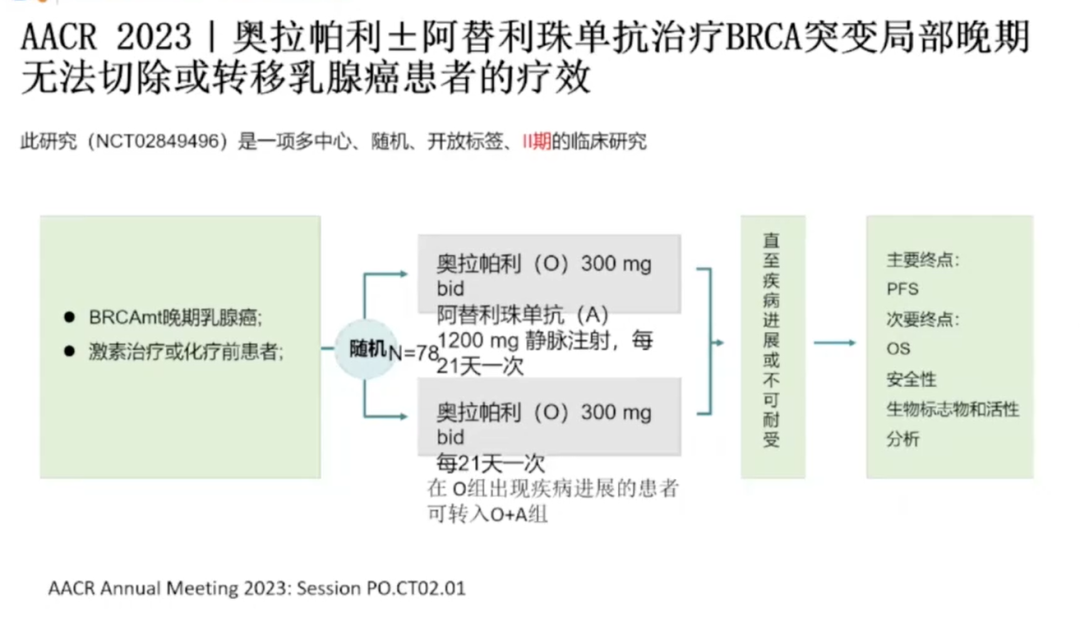 NCT02849496研究显示:奥拉帕利或奥拉帕利+阿替利珠单抗(A)在两个治疗组中均产生了具有临床意义的PFS;但阿替利珠单抗的添加并未显著增加PFS。总体来说,两组的治疗耐受性良好,出现的副作用也在预期范围内。但这项随机试验也表明,在晚期BRCAmt乳腺癌患者的PARPi(奥拉帕利)中加入免疫治疗(A)不会增加治疗反应,但会带来额外的毒性。