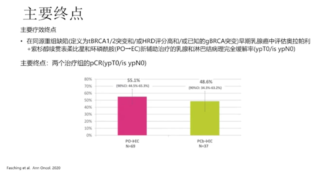 GeparOLA研究对在紫杉醇中增加奥拉帕利用于同源重组缺陷(HRD)(g/tBRCA1/2突变和/或HRD评分高)HER2阴性早期乳腺癌新辅助治疗进行了探索性研究,结果显示PO-EC vs.PCb-EC两治疗组的pCR率无差异。PO-EC组的iDFS、DDFS和OS呈现劣效于PCb-EC组的趋势。g/tBRCA突变患者接受PO-EC和PCb-EC的iDFS相同,可假设:在具g/tBRCA突变的HER2阴性乳腺癌患者中,奥拉帕利可替代卡铂;但是在无g/tBRCA突变的同源重组缺陷(HRD)肿瘤患者中,含奥拉帕利的NACT呈劣效性结果,但这些数据需要在更大型的研究中进行验证。
