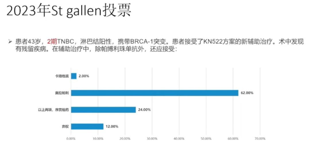 杨文倩教授还提到,在2023年SGBCC的投票中曾就“某患者做过遗传基因检测,做过肿瘤基因组检测,没有遗传突变。然而,肿瘤存在体细胞BRCA1突变。如果药物可及,您会给予奥拉帕利辅助治疗吗?”这一问题进行投票,48.28%的专家选择是会给予奥拉帕利辅助治疗。而在另一病假设例中:“患者43岁,2期TNBC,淋巴结阳性,携带BRCA-1突变。患者接受了KEYNOTE-522方案的新辅助治疗。术中发现有残留疾病。在辅助治疗中,除帕博利珠单抗外,还应接受哪种方案治疗?”62%的专家表示会选择奥拉帕利进行治疗。这可以看出,大部分专家还是肯定奥拉帕利在辅助治疗中的应用价值。