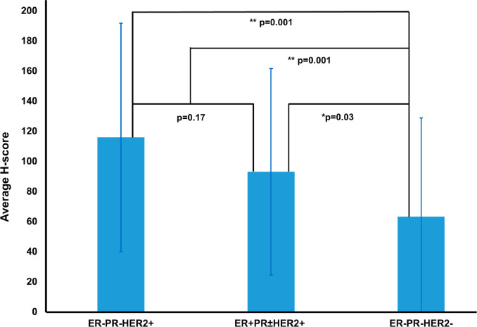 △ER-/PR-/HER2+、ER+/PR±/HER2+和ER-/PR-/HER2-中的pRb H平均分数