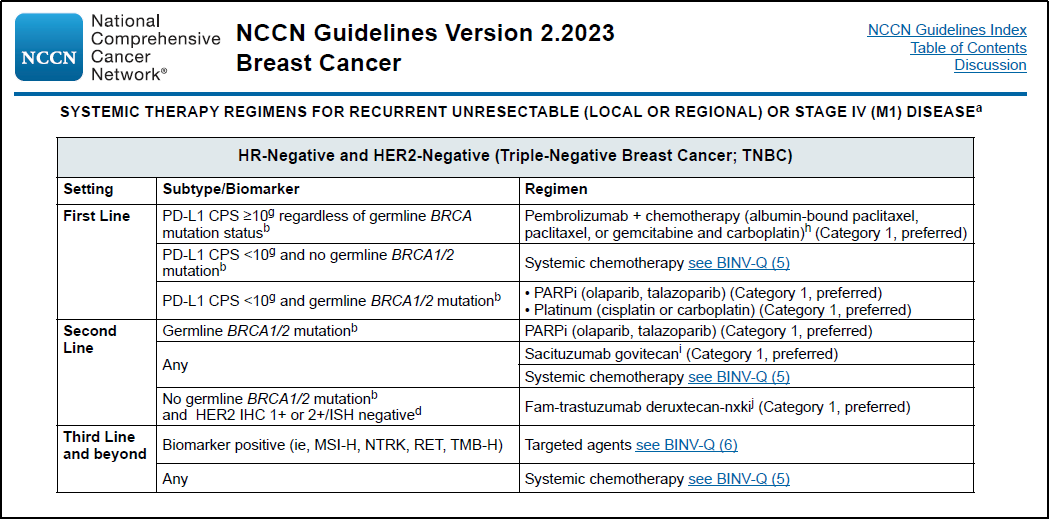 NCCN指南针对TNBC二线治疗的ADC推荐中,SG作为优选方案,而在HR-/HER2-Low的患者中,T-DXd也是优选方案(1类证据)。
