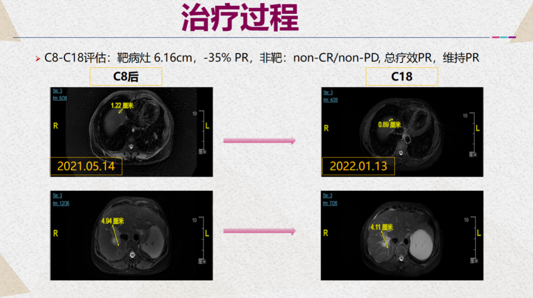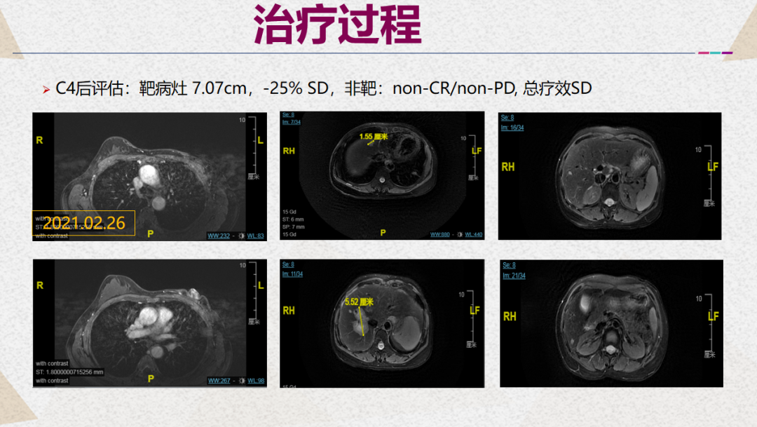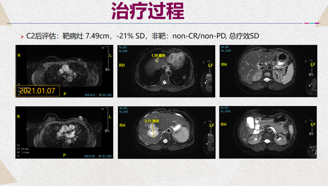 杨谨教授:该病例中患者为初诊Ⅳ期的乳腺癌且出现孤立性肝转移,在CDK4/6抑制剂出现进展后接受化疗,后检测为HER2低表达。我们假设将有效的治疗药物(DS-8201)前移,患者从治疗开始就有良好的缩瘤效果,然后采用多学科的综合治疗,从而实现更好的病情控制。如果让您进行选择,您会如何进行决策?