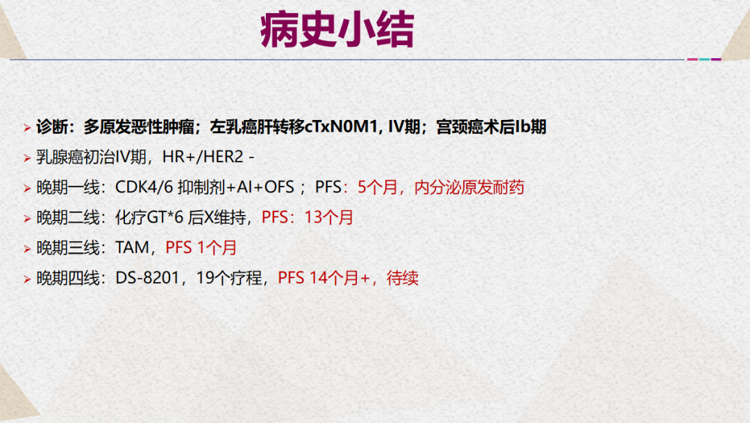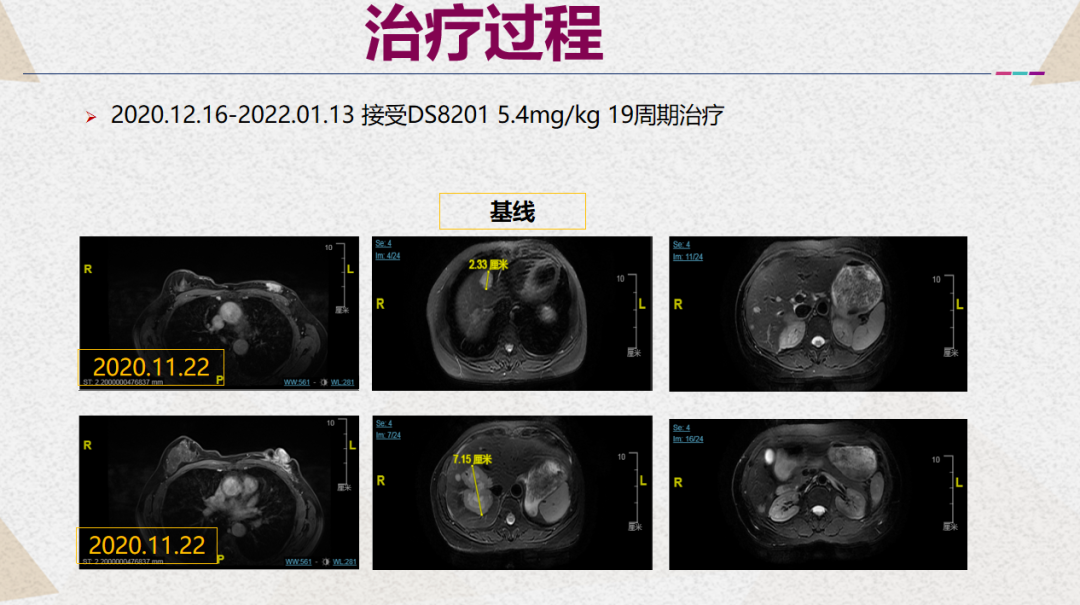 李慧慧教授:由于该患者化疗后又出现疾病进展,我不会选择化疗方案作为下一步治疗,我认为换一种内分泌联合靶向治疗也不确定患者是否能有好的疾病控制效果。因此根据DB-04研究的数据,我会建议患者考虑应用DS-8201(ADC药物)进行治疗。